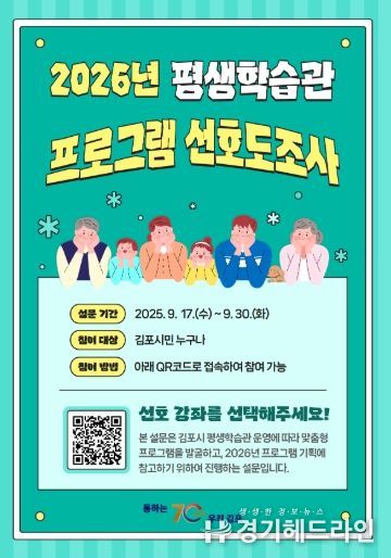 [경기헤드라인=문수철 기자] 김포시는 9월 17일부터 9월 30일까지 2026년 평생학습 프로그램 선호도 조사를 실시한다.