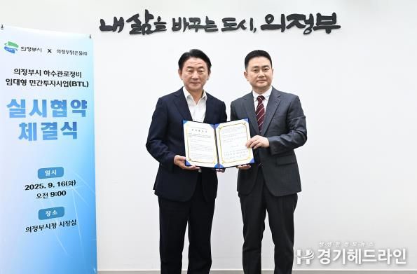 [경기헤드라인=문수철 기자] 의정부시는 9월 16일 의정부맑은물주식회사와 ‘하수관로정비 임대형 민간투자사업(BTL)’에 대한 실시협약을 체결했다.