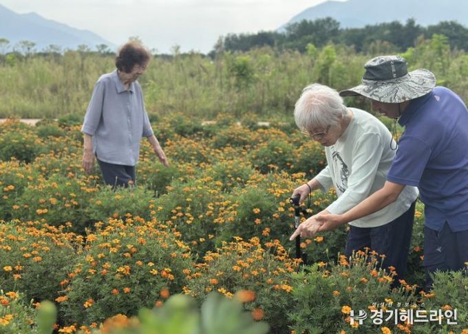 [경기헤드라인=문수철 기자] 하남시는 16일 당정근린공원 메리골드 꽃길에서 영락경로원 치매 어르신들과 함께 치유농업 프로그램을 진행했다고 밝혔다. 황금빛으로 물든 꽃들은 어르신들에게 편안한 휴식과 작은 웃음을 전했다.