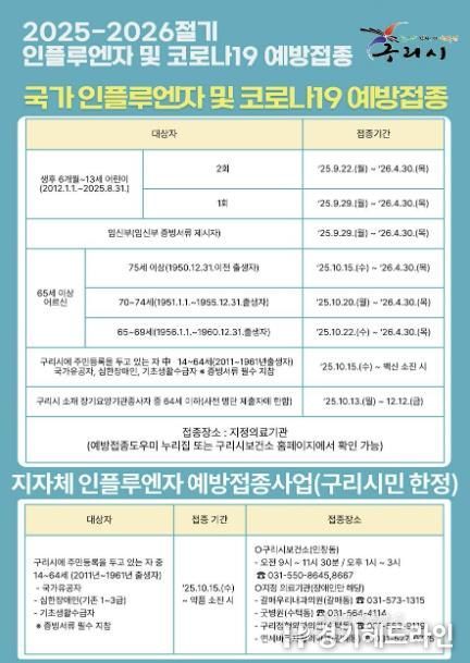 [경기헤드라인=문수철 기자] 구리시는 2025~2026절기 인플루엔자와 코로나19 유행에 대비해 오는 9월 22일부터 2026년 4월 30일까지 관내 110개 위탁의료기관에서 무료 예방접종을 실시한다고 밝혔다.