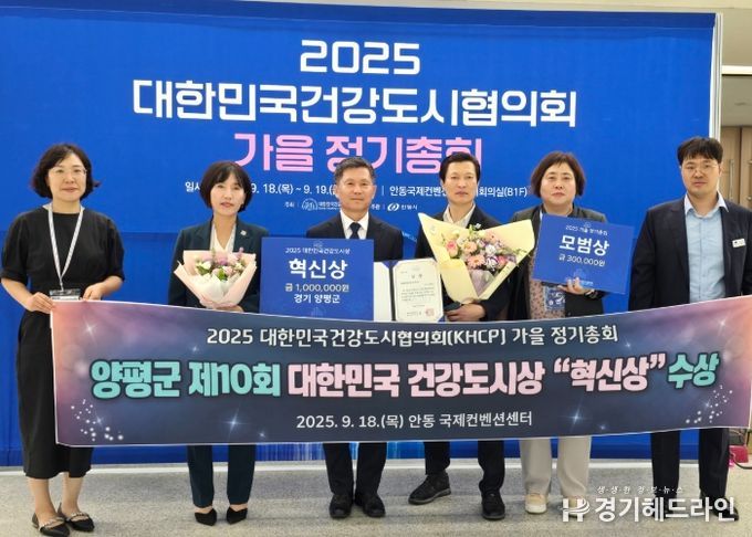 [경기헤드라인=문수철 기자] 양평군은 18일부터 19일까지 경북 안동시 안동국제컨벤션센터에서 열린 제21회 대한민국건강도시협의회 정기총회에서 ‘2025 대한민국 건강도시상 혁신상’을 수상했다고 밝혔다.