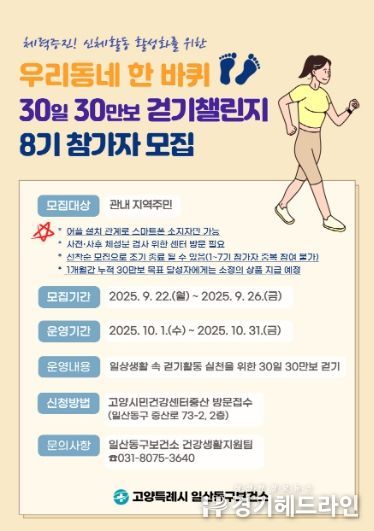 [경기헤드라인=김홍량 기자] 고양특례시 일산동구보건소는 지역주민의 체력증진과 신체활동량 증가를 위한‘우리동네 한 바퀴 30일 30만보 걷기챌린지’8기 참가자를 22일부터 모집한다고 밝혔다.