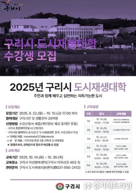 [경기헤드라인=문수철 기자] 구리시는 9월 22일부터 10월 10일까지 '2025년 구리시 도시재생 대학' 수강생을 모집한다고 밝혔다.