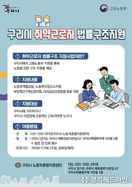 [경기헤드라인=문수철 기자] 구리시는 최근 경기 불황으로 임금체불 문제가 사회적 이슈로 드러남에 따라 '2025년 노동 약자 일터 개선 사업'의 일환으로 노동 약자 법률구조 사업을 오는 9월 22일부터 확대 시행한다고 밝혔다.