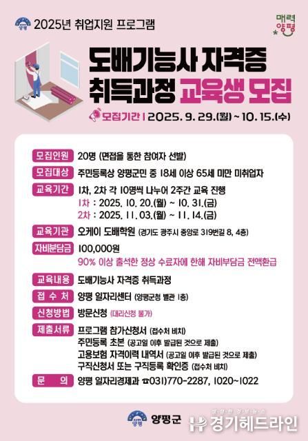 교육은 10월 20일부터 11월 14일까지 진행되며, 자세한 내용은 양평군 누리집 공고문에서 확인할 수 있고, 양평군청 일자리경제과로 문의하면 된다.