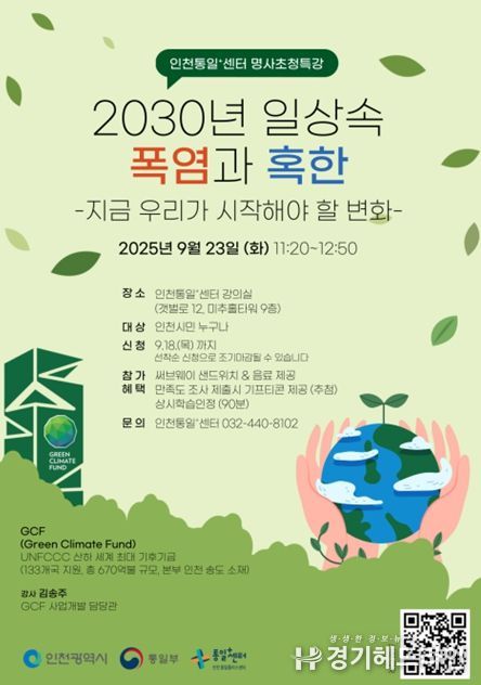 [경기헤드라인=문수철 기자] 인천광역시는 9월 23일 인천통일플러스센터(연수구 송도동 소재)에서 녹색기후기금(GCF)의 전문가를 초청, 기후위기의 심각성과 대응방안을 주제로 하는 특별 강연을 개최했다고 밝혔다.