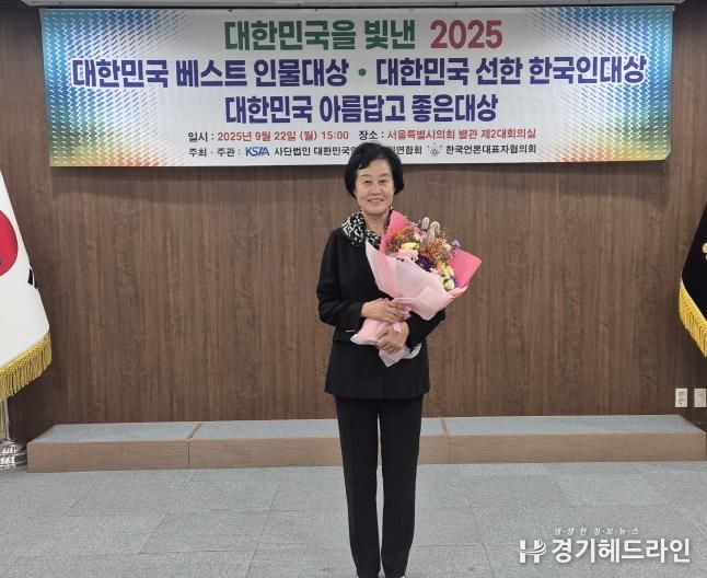 [경기헤드라인=문수철 기자] 경기도의회 건설교통위원회 박명숙 의원(국민의힘, 양평1)이 22일 서울시의회 별관 2층에서 열린 ‘2025 대한민국 베스트 인물대상’에서 광역의정대상에 선정되는 영예를 안았다.