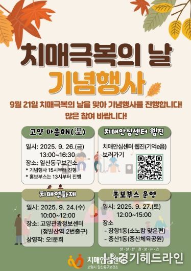 26일에는 치매극복의 날 행사‘고양 마음ON(溫)’을 일산동구보건소에서 오후 3시에 개최한다.