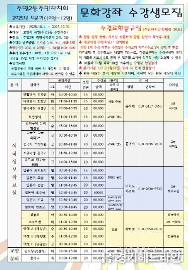 4분기 문화강좌는 고양시민을 대상으로 하며 주엽2동 주민을 우선 모집하며 오는 9월 26일까지 신청 가능하다.