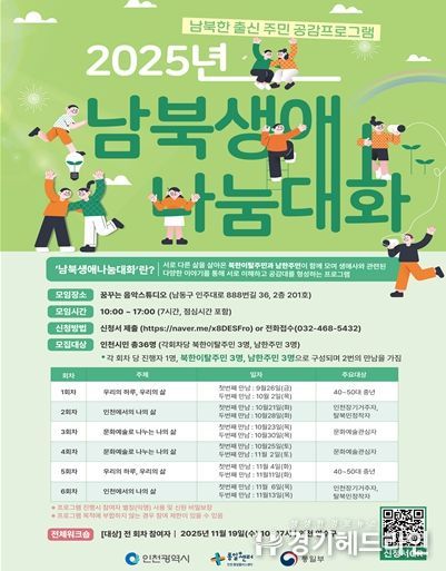 [경기헤드라인=문수철 기자] 인천광역시는 북한이탈주민과 인천 주민이 서로의 삶을 이야기하며 공감대를 형성하는 시민참여형 프로그램인 ‘남북생애나눔대화’ 를 9월 26일부터 11월 19일까지 진행한다고 밝혔다.