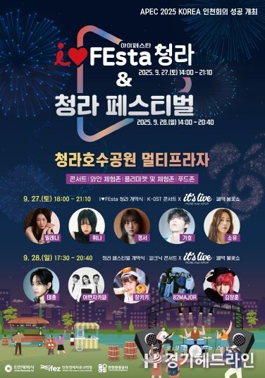 [경기헤드라인=문수철 기자] 인천경제자유구역청이 주최하고 인천관광공사(사장 백현)가 주관하는‘2025 I♥FEsta 청라 & 청라 페스티벌’이 9월 27일과 27일 이틀간 청라 호수공원 멀티프라자에서 열린다.