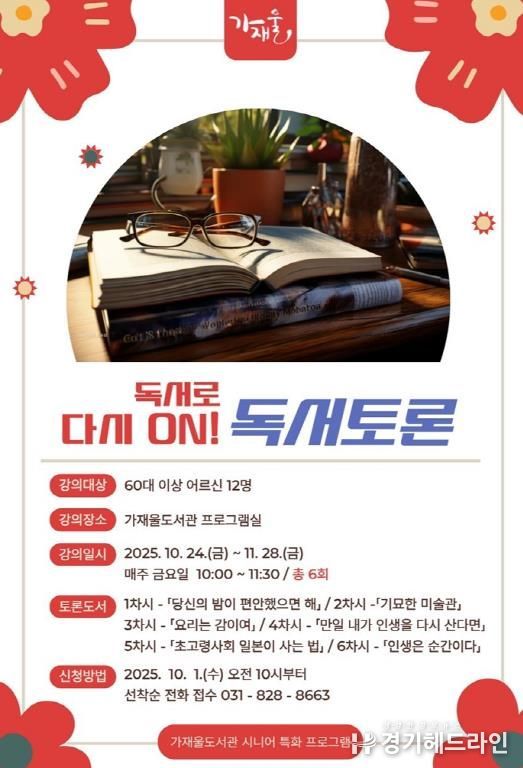‘책으로 다시 ON! 독서토론’은 큰글자도서를 활용해 독서 접근성을 높였으며, 참여자들이 책 속 주제를 바탕으로 생각을 나누며 자기 성찰과 건강한 소통을 도모하는 시간을 마련한다. 토론 프로그램은 10월 24일부터 매주 금요일 오전 10시부터 낮 12시까지 진행된다.