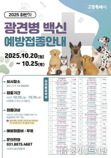 [경기헤드라인=김홍량 기자] 고양특례시는 2025년 하반기 광견병 예방접종을 10월 20일부터 실시한다고 밝혔다.