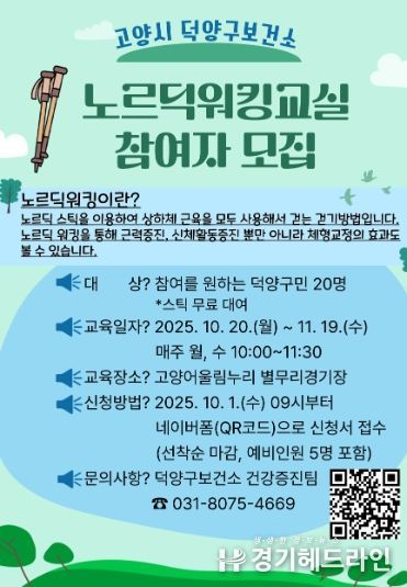 [경기헤드라인=김홍량 기자] 고양특례시 덕양구보건소는 지역 주민의 비만예방관리 및 신체활동 활성화를 위해 오는 10월 20일부터 11월 19일까지 ‘노르딕워킹교실’을 운영한다고 밝혔다.
