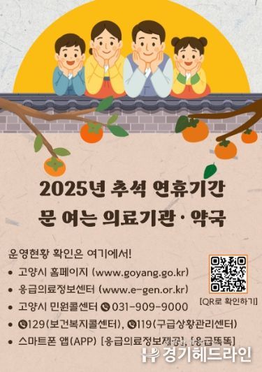 [경기헤드라인=김홍량 기자] 고양특례시는 다가오는 추석 연휴(10월 3일~9일, 7일간) 동안 발생할 수 있는 진료 공백을 최소화하기 위해 관내 의료기관 및 약국과 협력하여 응급진료체계를 운영한다고 밝혔다.