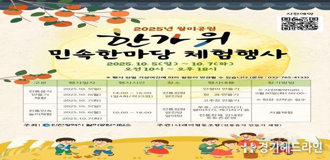 [경기헤드라인=문수철 기자] 인천광역시 월미공원사업소는 오는 10월 5일부터 7일까지 3일간 월미공원 내 전통정원(양진당)에서 ‘한가위 민속한마당 체험행사’를 개최한다고 밝혔다.