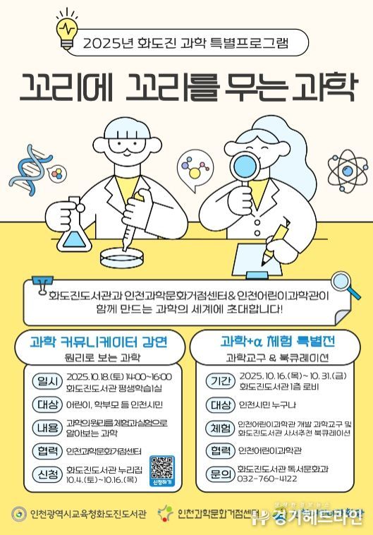 [경기헤드라인=문수철 기자] 인천광역시교육청화도진도서관은 지역사회의 과학문화 확산을 도모하기 위하여 오는 10월 16일부터 31일까지 인천시민 대상‘꼬리에 꼬리를 무는 과학’을 운영한다.