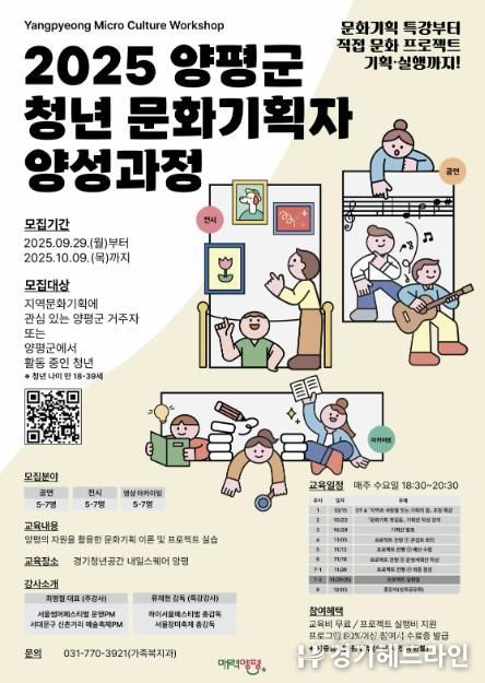 [경기헤드라인=문수철 기자] 양평군은 청년들의 문화·예술 기획 역량 강화를 통해 지역사회 문화 활성화와 청년 일자리 창출을 지원하고자 ‘2025년 양평군 청년 문화기획자 양성과정’을 10월부터 12월까지 운영한다고 밝혔다.
