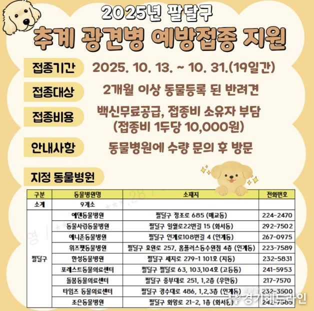 [경기헤드라인=문수철 기자] 수원시 팔달구는 반려동물을 안전하게 보호하기 위해 10월 13일부터 10월 31일까지 광견병 백신을 무료 지원한다고 밝혔다.