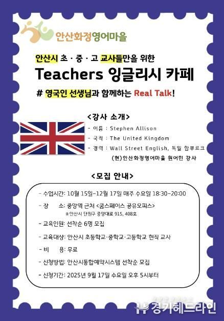 [경기헤드라인=문수철 기자] 안산시 안산화정영어마을은 오는 15일부터 12월 17일까지 관내 소속 교사를 대상으로 ‘티처스(Teachers) 잉글리시 카페’를 운영한다고 10일 밝혔다.
