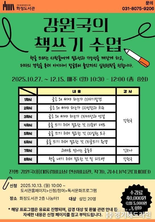 [경기헤드라인=김홍량 기자] 고양특례시는 10월 27일부터 12월 15일까지 매주 월요일 오전 10시 30분부터 12시까지, 화정도서관 2층 나눔터1에서 ‘강원국의 책쓰기 수업’프로그램을 운영한다고 밝혔다.