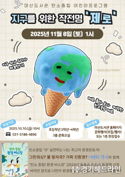 [경기헤드라인=문수철 기자] 김포시 마산도서관에서 오는 11월 8일 오후 1시부터 3시까지, 초등학교 2학년~4학년 어린이를 대상으로 탄소중립 어린이 프로그램 책풍당당 '지구를 위한 작전명 ‘제로’'를 운영한다.