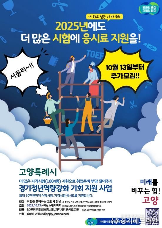 이번 추가 모집은 미취업 청년의 어학·자격시험 응시 비용 부담을 완화해 취업 준비에 실질적인 도움을 주기 위한 것으로, 고양시에 거주하는 18세부터 39세까지(1985년~2007년생)의 청년이 신청할 수 있다.