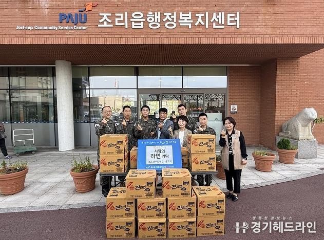 [경기헤드라인=김홍량 기자] 파주시 조리읍은 지난 2일, 3653부대 장병들과 예수가온교회가 추석을 맞아 지역 내 어려운 이웃을 돕기 위해 라면 16박스를 기탁했다고 밝혔다.