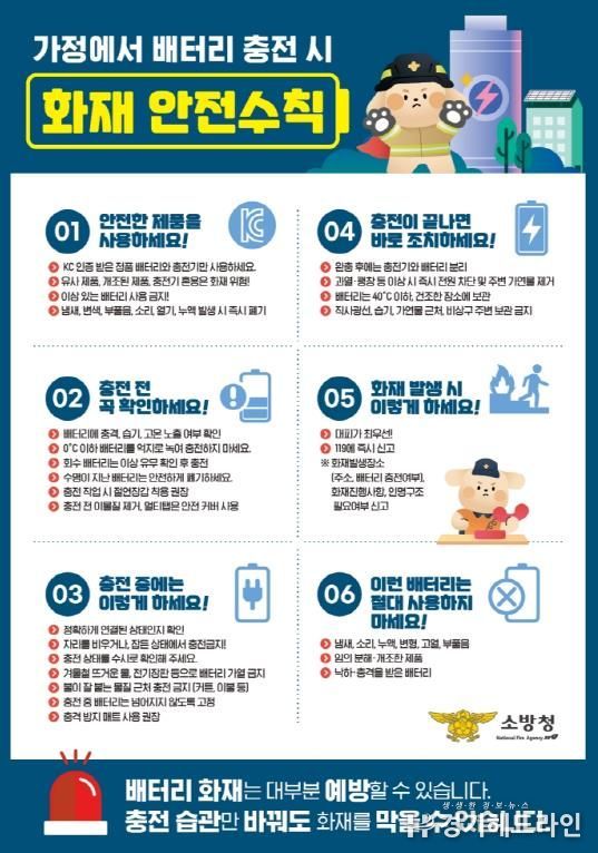 소방서는 이러한 배터리 화재 사례를 통해 전동킥보드와 전기자전거와 같은 생활 속 배터리 사용 기기의 안전수칙을 다시 한번 강조하고 나섰다. ▲KC 인증 제품 사용 ▲과충전 주의 ▲외출 및 취침 시 충전 금지 ▲현관문·비상구 근처에서 충전 금지 등과 같은 화재예방 수칙을 안내하며 배터리의 이상이 발견되면 즉시 사용을 중단하고 119에 신고할 것을 당부했다.