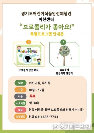 [경기헤드라인=정현수 기자] 이천시 어린이식품안전체험관은 오는 10월부터 12월까지 특별프로그램 ‘브로콜리가 좋아요’를 운영한다고 밝혔다.
