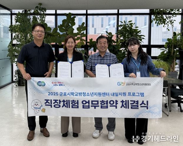 [경기헤드라인=문수철 기자] 군포시청소년재단(대표이사 김덕희), 군포시학교밖청소년지원센터(센터장 강연미)는 시각디자인 분야로의 진학과 진로를 희망하는 학교 밖 청소년을 지원하기 위해 관내 디자인 전문업체인 ㈜은진과 직장체험 업무협약을 체결했다고 밝혔다.