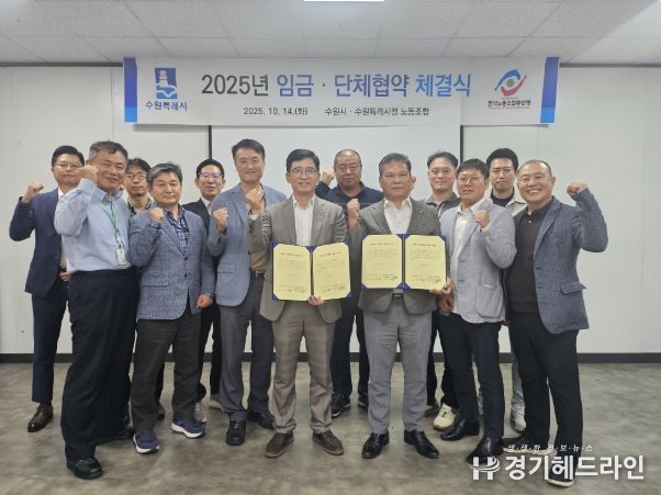 [경기헤드라인=문수철 기자] 수원특례시는 14일 수원시청 노동조합(환경관리원)과 ‘2025년 임금 및 단체협약’을 체결했다.