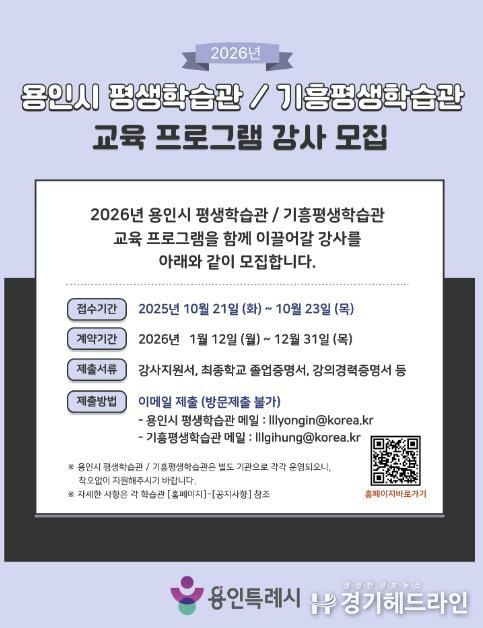 [경기헤드라인=문수철 기자] 용인특례시는 21일부터 23일까지 3일간 ‘2026년 평생학습관 프로그램’을 운영할 강사를 모집한다고 15일 밝혔다.