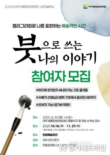 [경기헤드라인=정현수 기자] 여주세종문화관광재단은 오는 10월 16일부터 두달간 여주시민을 위한 문화예술교육 프로그램인 시민예술학교 '붓으로 쓰는 나의 이야기'를 진행한다.