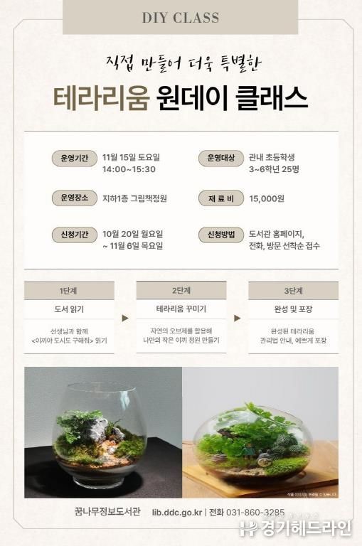 [경기헤드라인=김윤종 기자] 동두천시 도서문화사업소 꿈나무정보도서관은 오는 10월 20일부터 초등학교 3~6학년을 대상으로 『테라리움 만들기』 원데이 클래스를 운영한다고 밝혔다.