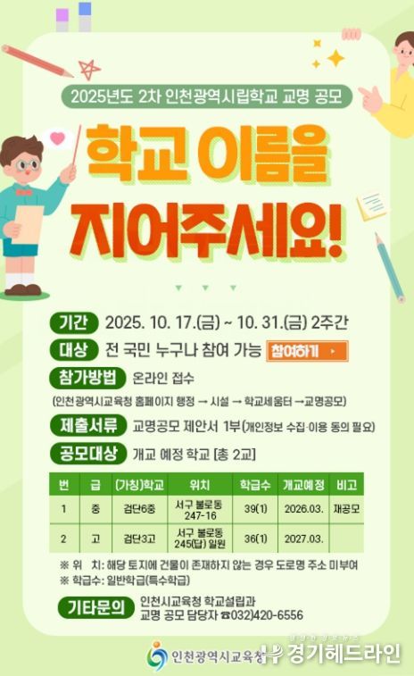 [경기헤드라인=문수철 기자] 인천광역시교육청은 10월 17일부터 31일까지 2주간 신설 중·고교 2곳의 학교명을 공모한다.