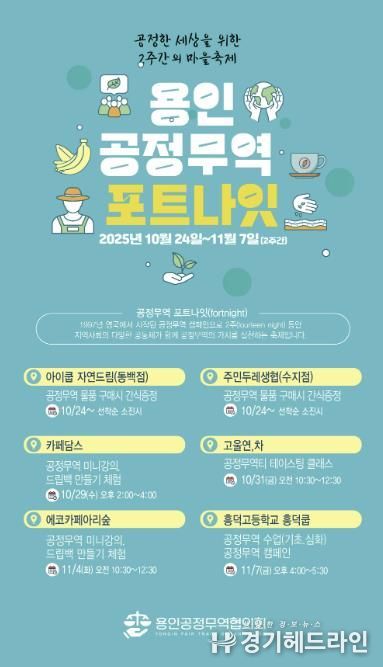 [경기헤드라인=문수철 기자] 용인특례시와 용인공정무역협의회는 10월 24일부터 11월 7일까지 2주간 용인시 공정무역 포트나잇 축제를 개최한다.