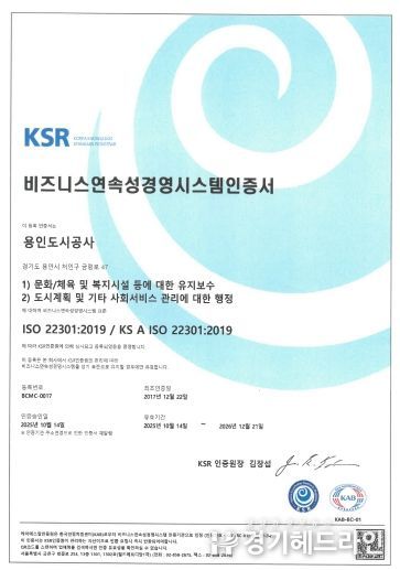 [경기헤드라인=문수철 기자] 용인도시공사는 지난 9월 29일부터 30일까지 진행된 ISO45001(안전보건경영시스템) 갱신심사 및 ISO22301(비즈니스연속성경영시스템) 사후관리심사에서 모두 ‘적합’ 판정을 받으며, 국제표준에 부합하는 안전관리체계를 지속적으로 유지하고 있음을 다시 한번 입증했다.