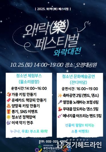 [경기헤드라인=문수철 기자] 부천여성청소년재단이 운영하는 부천시청소년센터는 오는 10월 25일 오후 2시, 부천 오정대공원에서 와!락(樂) 페스티벌 ‘와락대전’을 진행한다고 밝혔다.
