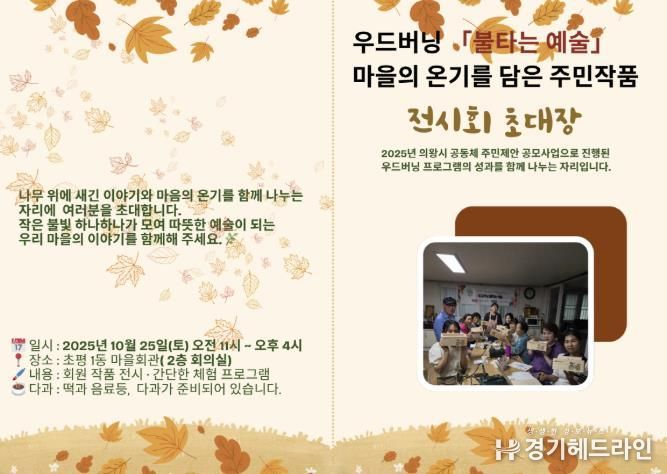 [경기헤드라인=문수철 기자] 의왕시는 마을공동체 자강불식이 오는 10월 25일 초평1동마을회관(윗새우대북길 14)에서'우드버닝, 불타는 예술'작품전시회를 개최한다고 밝혔다.