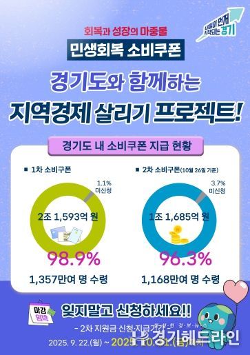한편 경기도의 지난 1차 소비쿠폰의 지급률은 98.9%로 1,357만여 명이 소비쿠폰 2조 1,593억 원을 수령한 바 있으며, 26일 현재 1차와 2차를 거쳐 지급된 소비쿠폰(약 3조 3,275억 원)의 91.5%가 사용된 것으로 나타났다.