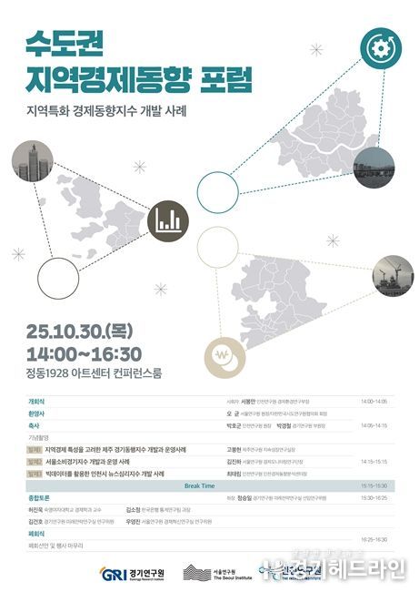 [경기헤드라인=문수철 기자] 인천연구원은 2025년 10월 30일 오후 2시부터 정동1928 아트센터 컨퍼런스룸에서 “지역특화 경제동향지수 개발 사례”를 주제로 '수도권 지역경제동향 포럼'을 개최한다.