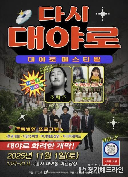 [경기헤드라인=문수철 기자] 시흥시는 올해 처음으로 열리는 ‘대야로 페스티벌-다시, 대야로’가 오는 11월 1일 대야동 미관광장에서 개최된다고 밝혔다. 이번 축제는 시흥시와 (재)시흥시도시재생지원센터가 주최하고, 대야동활성화추진위원회가 주관해 진행된다.