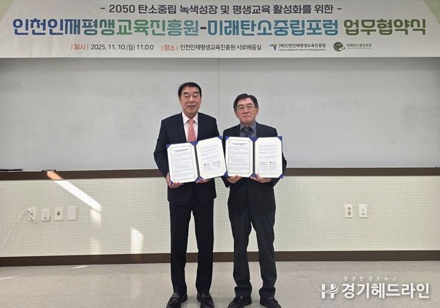[경기헤드라인=문수철 기자] 2025년 11월 10일, 인천인재평생교육진흥원과 미래탄소중립포럼이 탄소중립 시민교육과 평생교육 활성화를 위한 업무협약(MOU)을 체결했다.
