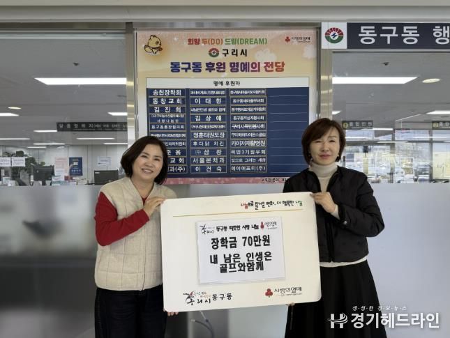 [경기헤드라인=문수철 기자] 구리시 동구동 행정복지센터는 지난 18일 동구동 행정복지센터 대회의실에서 '내 남은 인생은 골프와 함께' 모임으로부터 관내 취약계층 청소년을 위한 장학금 70만 원을 기탁받았다고 밝혔다.