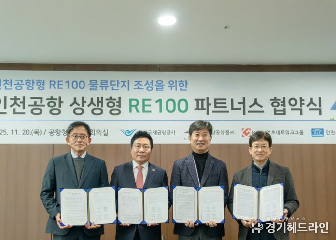 [경기헤드라인=문수철 기자] 인천국제공항공사는 20일 오전 공항청사 회의실에서 물류단지 입주기업 3개社와 함께 ‘상생형 RE100 파트너스 업무협약(MOU)’을 체결했다고 밝혔다.