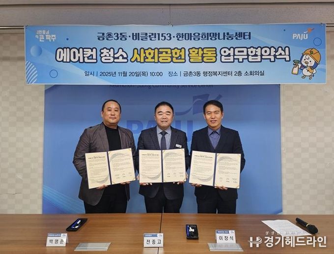 협약에 따라 금촌3동은 대상자 발굴 및 행정적 지원을 담당하며, ‘비클린153’은 전문 장비와 기술을 활용해 생활가전 청소 서비스를 무상으로 제공한다. 또한 ‘한마음희망나눔센터’는 가정용 청소용품 꾸러미를 무상으로 지원할 예정이다.