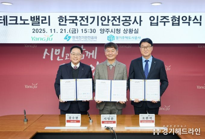 [경기헤드라인=문수철 기자] 경기주택도시공사(GH)는 21일 양주시청 상황실에서 양주시, 한국전기안전공사와 함께 ‘한국전기안전공사 북부지역본부’의 경기양주 테크노밸리 입주를 위한 협약식을 체결했다고 밝혔다.