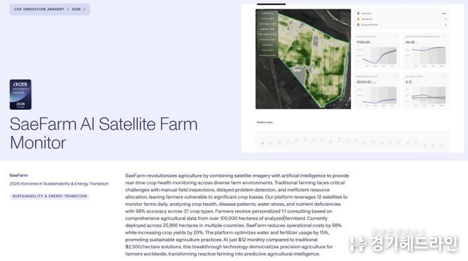 [경기헤드라인=문수철 기자] 경기도농업기술원과 연천군, 주식회사 새팜이 공동으로 추진한 ‘농림위성 영상 AI 분석기술 활용 생산단지 의사결정시스템’이 세계적 기술 전시회 ‘CES(세스) 2026’ 개최를 앞두고 혁신상을 수상했다.