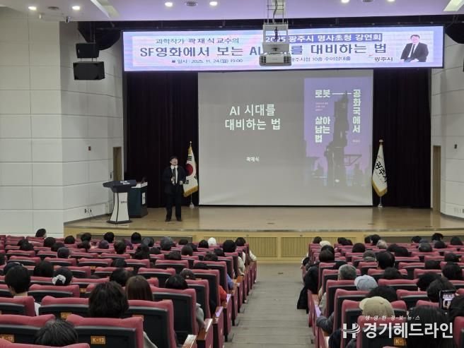 [경기헤드라인=정현수 기자] 광주시는 지난 24일 오후 7시 광주시청 수어장대홀에서 300여 명의 시민을 대상으로 곽재식 교수 초청 ‘2025년 제3회 명사 초청 강연회’를 개최했다.